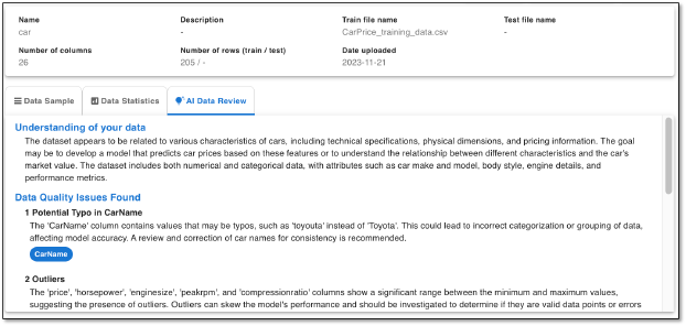• Detailed Dataset Insights: Extensive data overview, including statistics and AI-driven quality checks.